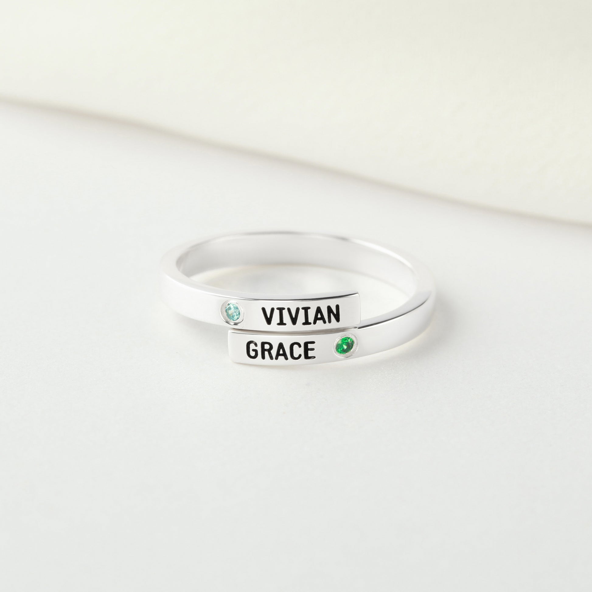 A shiny dainty personalized ring with names and sparkly birthstones of your choice. This ring is a unique gift for coming up Mother's Day.